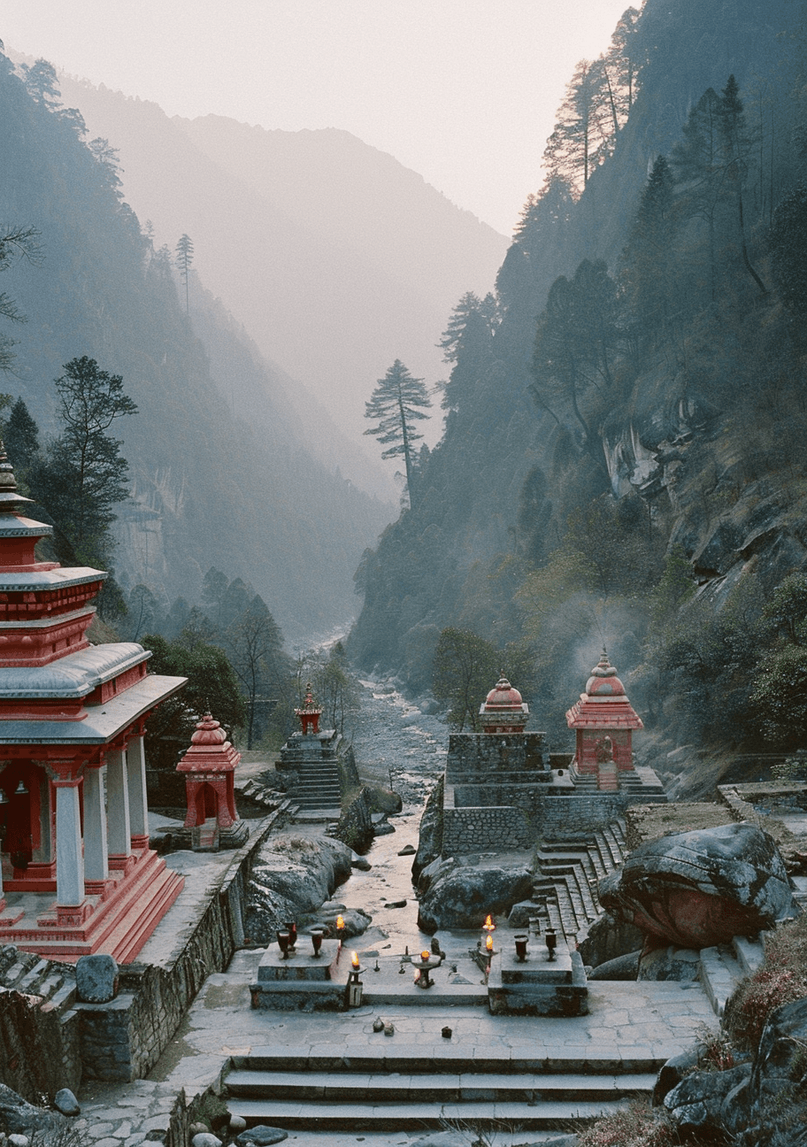 In a secluded valley of ancient stone temples, witness the Mahamrityunjay Pooja beside a mountain stream. The ritual unfolds slowly, invoking Shiva as the conqueror of death in a deeply meditative setting.